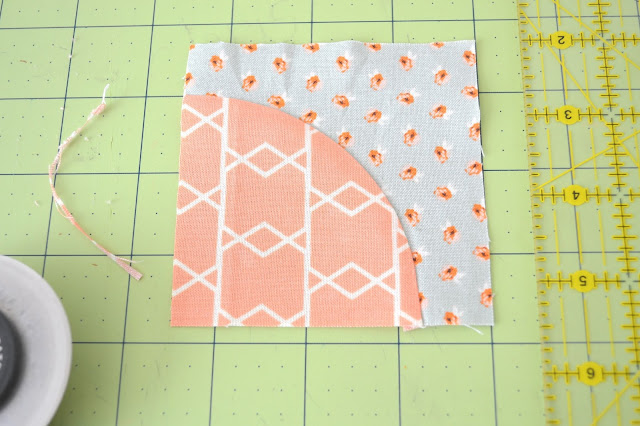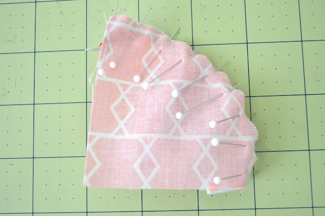 5. Repeat the process in steps 3 and 4 and cut out shapes from the rest of the three fat quarters. Now, you have 36 pieces of Mint Apricot Petals, 9 x 4 = 36 pieces of quarter circle pieces from the fat quarters.