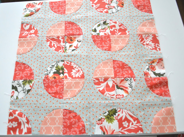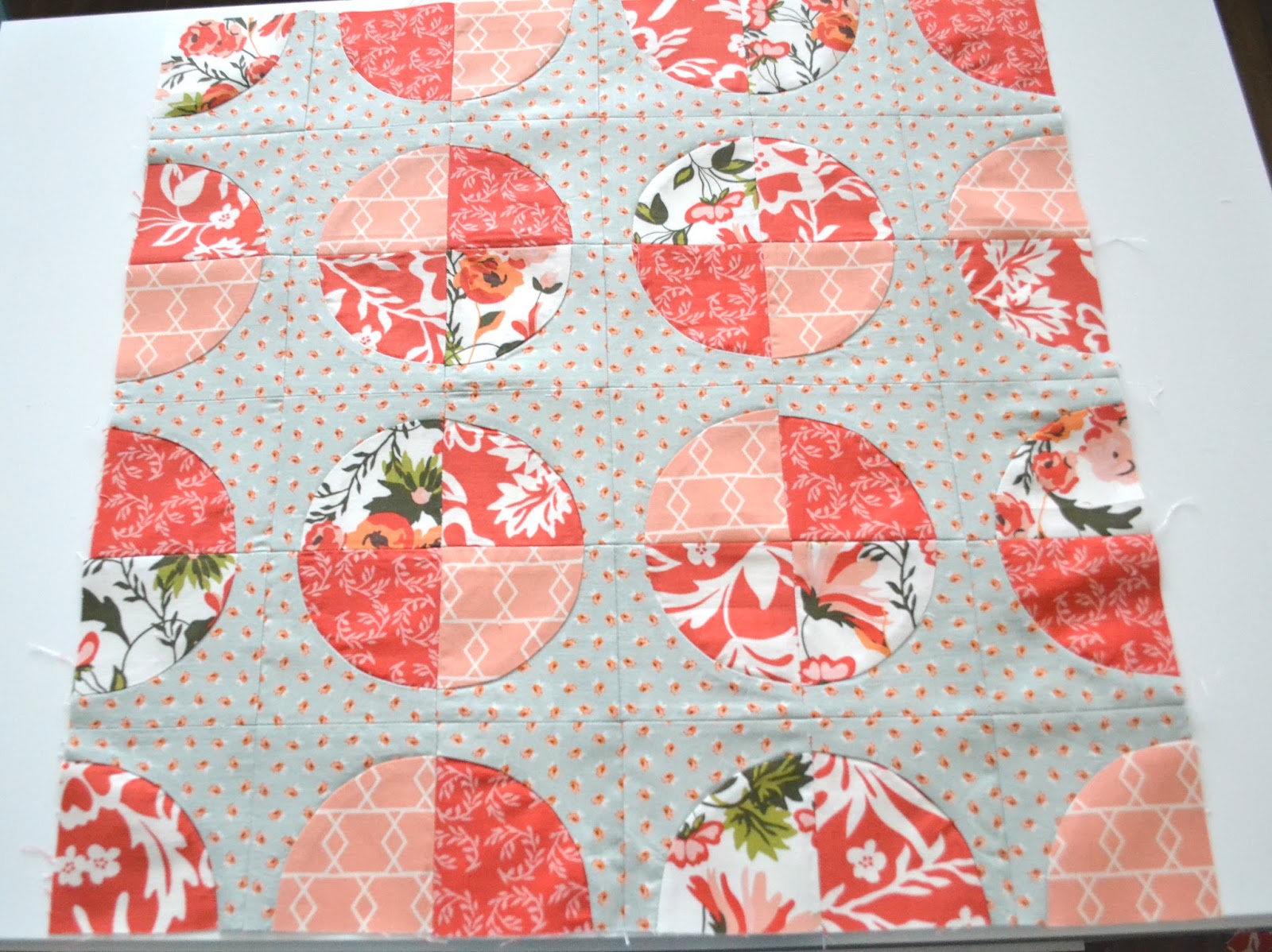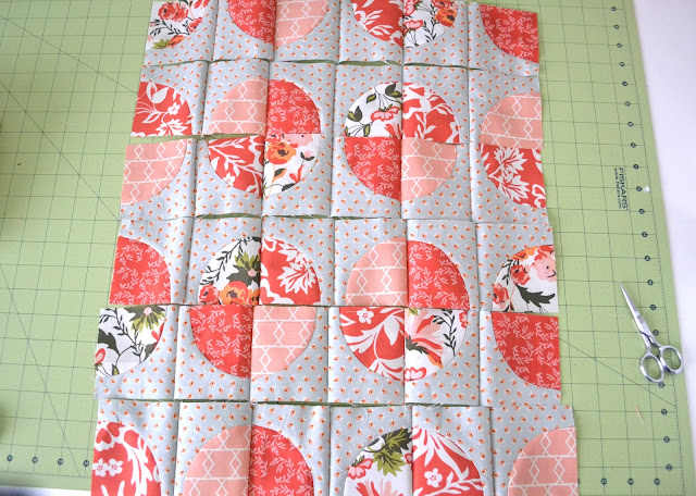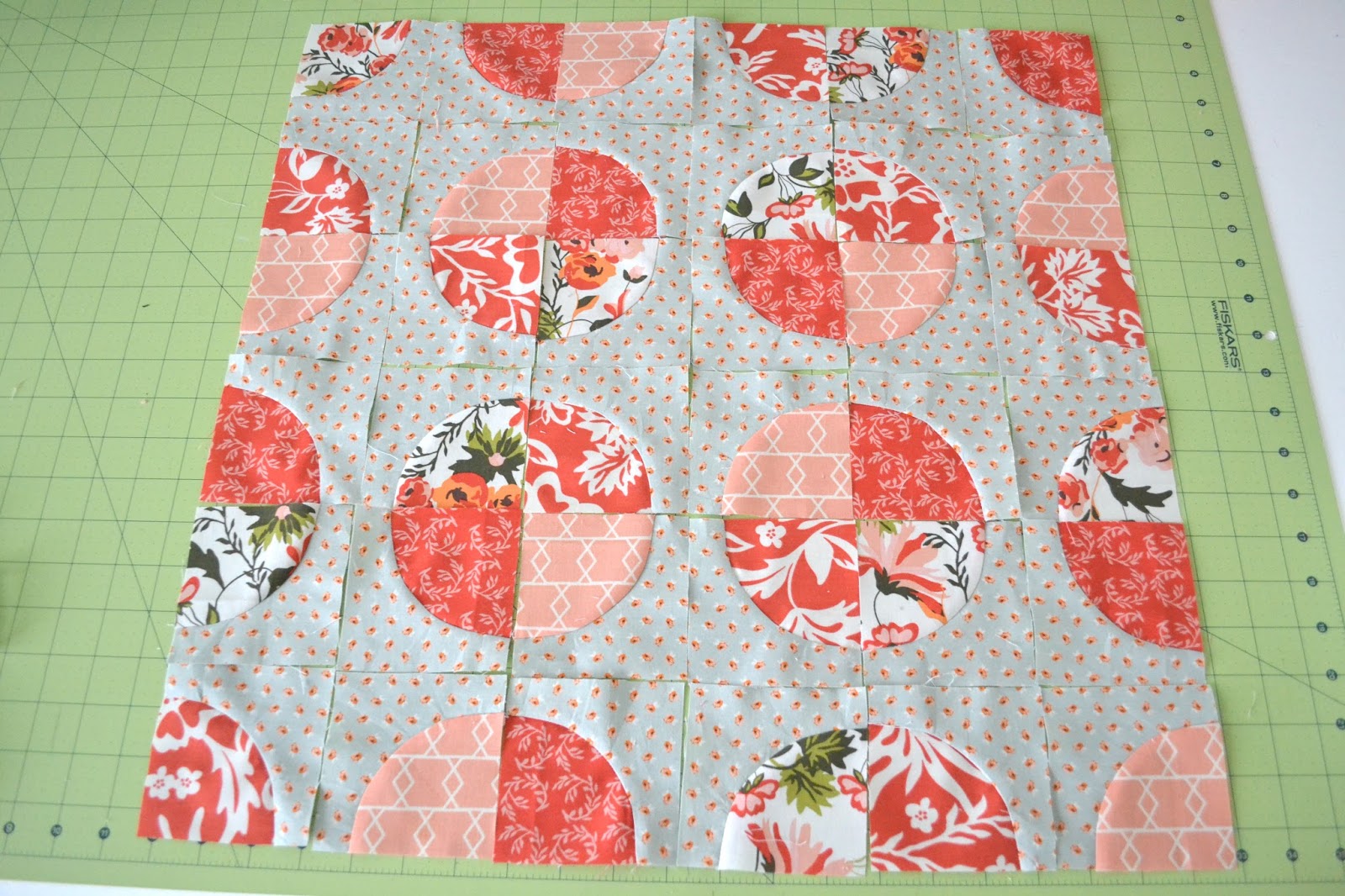 Hello I am Sachiko from Tea Rose Home! I am in love with Apricot & Persimmon by Carina Gardner. I love her use of colors and the beautiful timeless designs. Today, I am going to share a mini quilt I have created using her gorgeous fabrics! Before you begin, print out the templates I provide in a PDF. I traced them onto clear plastic to make template. It is so much easier and quicker to use those templates and cut out the shapes with small rotary cutter. You can also trace the template onto the fabric and cut them out with scissors if you prefer. Circle quilt (finished size 18 1/2″ x 18 1/2″)