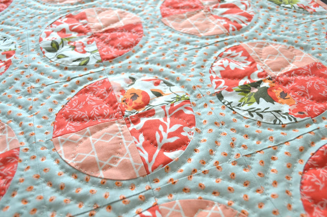 I am not going to cover the details of basting and such, but I used fat quarter left overs to piece the backing and bias tape. Ready to see the end result??
