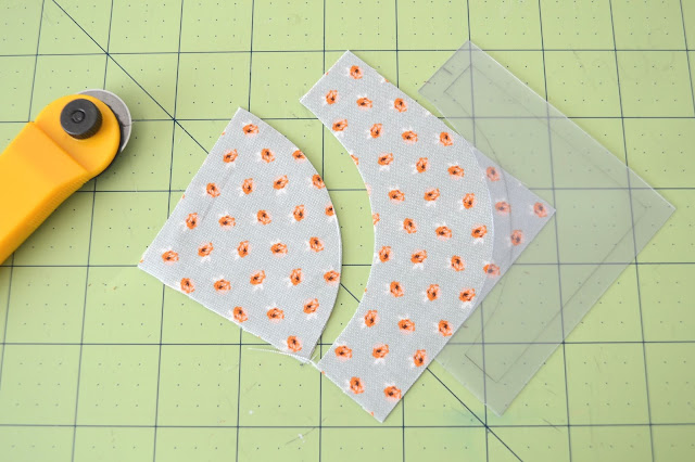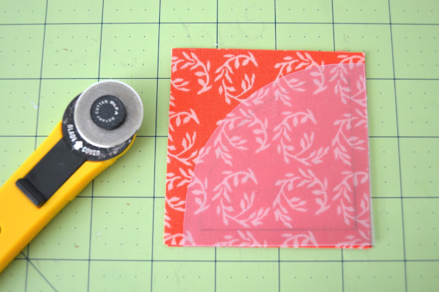 2. Use template 1. Match the two straight edges of the template to the two edges of the fabric square and cut out the shape.