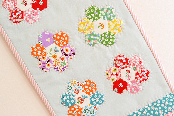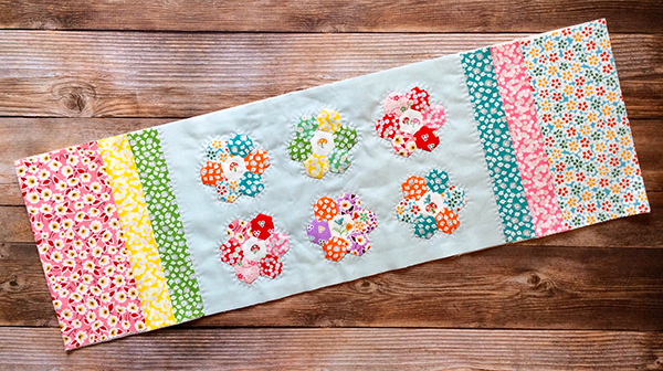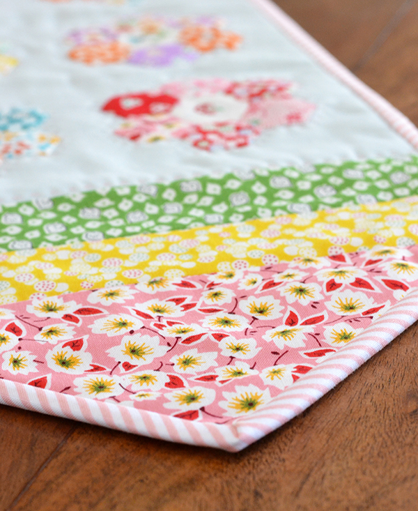 I made this sweet English Paper Pieced (EPP) applique table runner with Hope Chest 2 – I love the bright colours and pretty prints of this fabric range by Penny Rose Designs. For the fussy cutters amongst us – the toadstool print that I used for my flowers’ centres is an absolute must-have! The pink bias stripes that I used for the binding is from my own debut collection, Sweet Orchard for Riley Blake Designs.