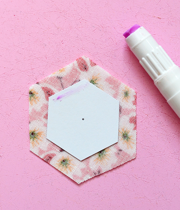 4. Place a fabric hexie wrong side facing up and put the hexie template at the centre. Put fabric glue along one edge as shown, then quickly fold over the edge of the fabric so it sticks to the glue. Try not to get glue on the edge of the paper if you can, as this makes it a little more difficult to remove the papers later.