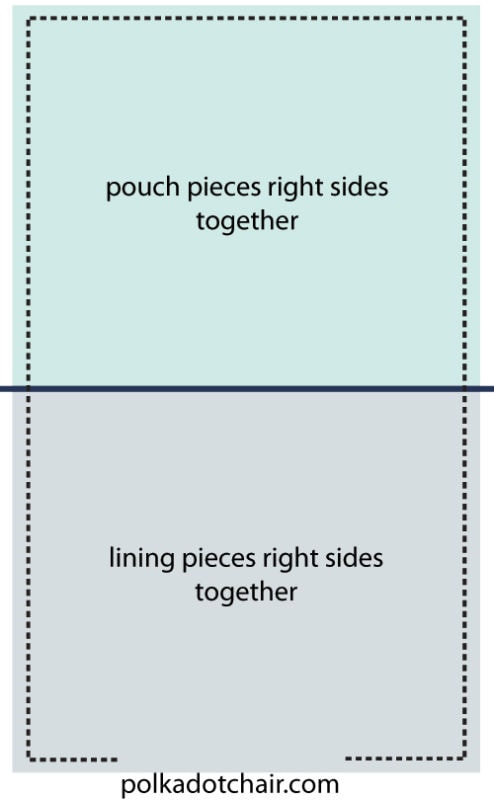 Pin the right side of the zipper to the right side of the pouch front piece. Pin the wrong side of the zipper to the right side of one of the lining pieces. Stitch using a zipper foot. Repeat for other side of the zipper. Cut off any part of the zipper that is longer than the pouch. Press the pouch pieces away from the zipper and top stitch along both sides of the zipper (this will keep the lining from getting caught in the zipper).