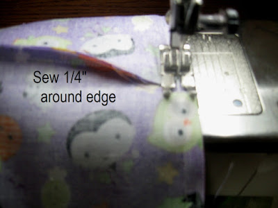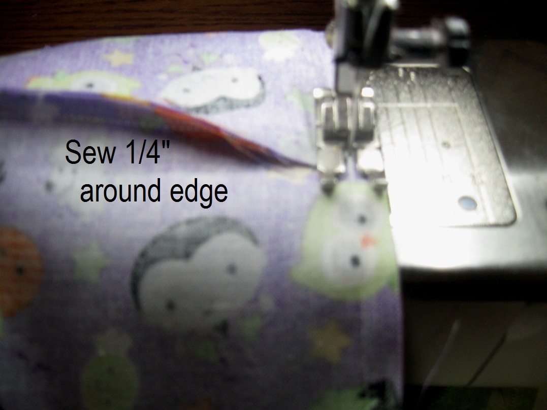 And now, simply stitch a 1/4″ seam around the pinned top edge. Once again, be sure and back stitch a bit at the beginning and the end to secure everything in place.