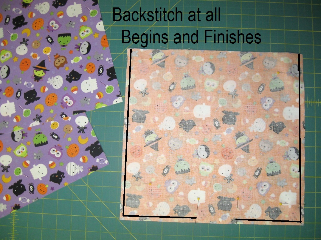 Place two panel pieces with right sides together aligning the raw edges and being sure the squares in the two panels align. You can pin if you like or just align as you stitch. Sew a 1/4″ seam around the two sides and the bottom of the panels, pivoting at the corners. Be sure and backstitch at the beginning and ending of your seam to secure the stitching. Repeat for however many bags you want to make and set them aside.