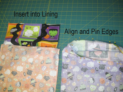 Almost there!!! Insert the pinned bag into the lining so that right sides are together. Align the raw edges of the lining and the bag and pin around the top. I like to nest the two side seams first and pin those in place. Then I move around the top of the bag, pinning the center first, and then putting a second pin in by each of the handles.